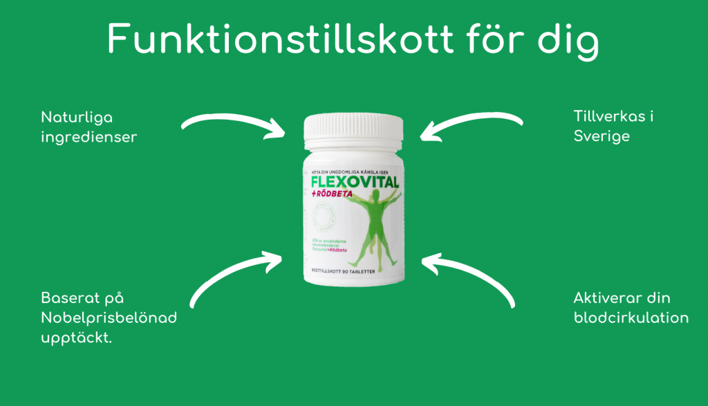 Flexovital+Rödbeta är ett Svenskt kosttillskott, innehållande naturliga ämnen för bland annat muskler, blodkärl, leder och immunsystem*. Stela värkande leder, ont i ländryggen och dålig rörlighet är ofta ett resultat av nedsatt blodcirkulation. Kalla händer och fötter är också typiska kännetecken på dålig cirkulation, att se till att din blodcirkulation är optimal är den bästa garantin för ett långt aktivt liv. För att öka din blodcirkulation krävs motion och bra kost, gärna i kombination med Flexovital+Rödbeta.