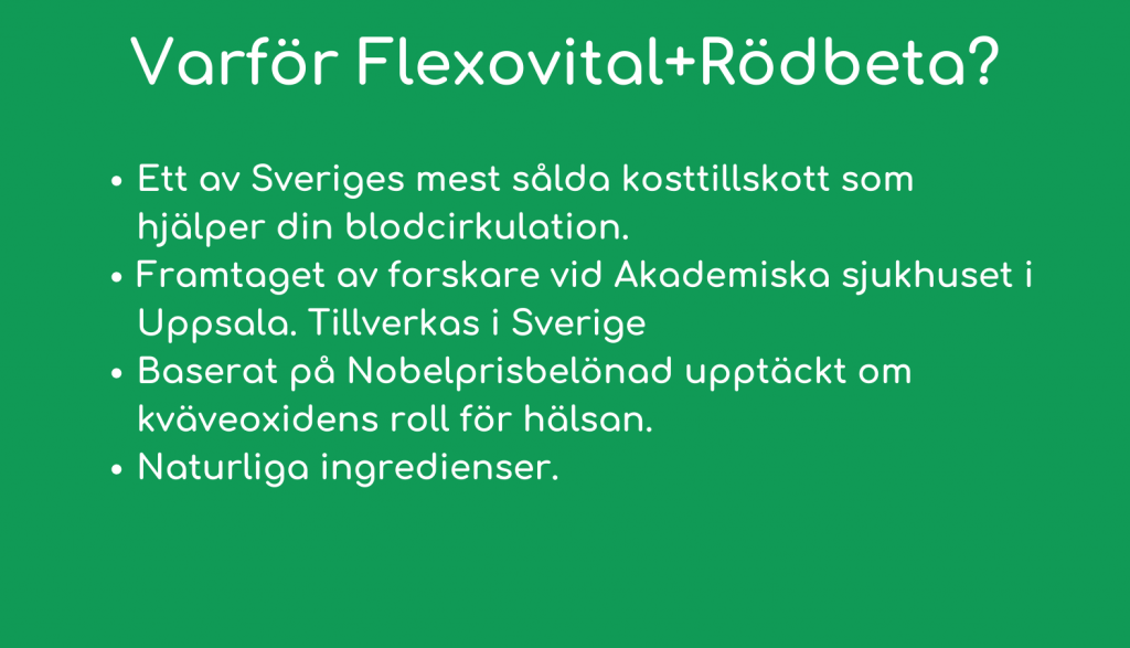 Flexovital+Rödbeta är ett Svenskt kosttillskott, innehållande naturliga ämnen för bland annat muskler, blodkärl, leder och immunsystem*. Stela värkande leder, ont i ländryggen och dålig rörlighet är ofta ett resultat av nedsatt blodcirkulation. Kalla händer och fötter är också typiska kännetecken på dålig cirkulation, att se till att din blodcirkulation är optimal är den bästa garantin för ett långt aktivt liv. För att öka din blodcirkulation krävs motion och bra kost, gärna i kombination med Flexovital+Rödbeta